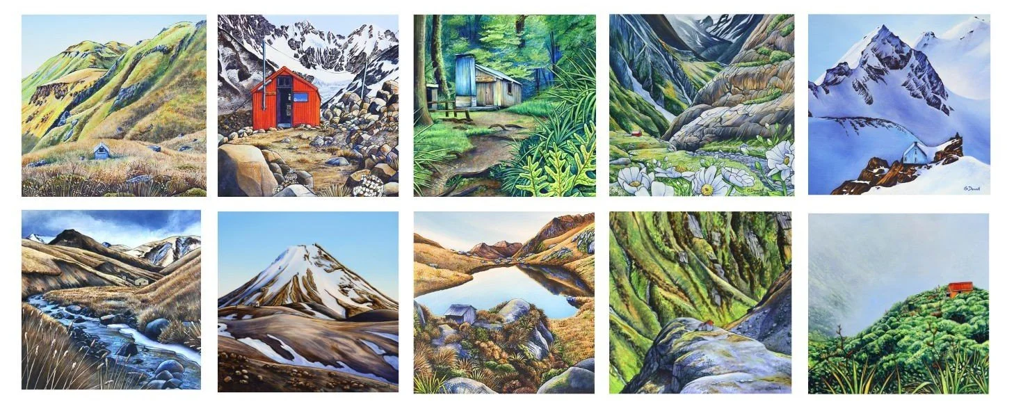 This year, I’ve partnered with The Backcountry Trust to create a series of ‘Hut Scapes’, paintings celebrating some of Aotearoa’s most iconic and remote backcountry huts.