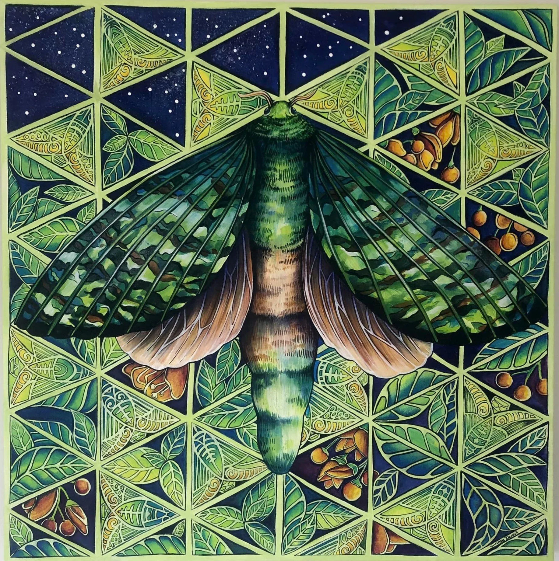 Puriri moths live as a grub in the bark of a puriri tree for up to six years then spend two days as a moth. In this painting the background pattern is made up of hexagons to represent the six years as a grub. In each set of six whichever way you look at it you’ll find two stylised moths to show the two days they spend in that form. In the other segments are leaves, berries and flowers from the puriri tree and the starry sky.