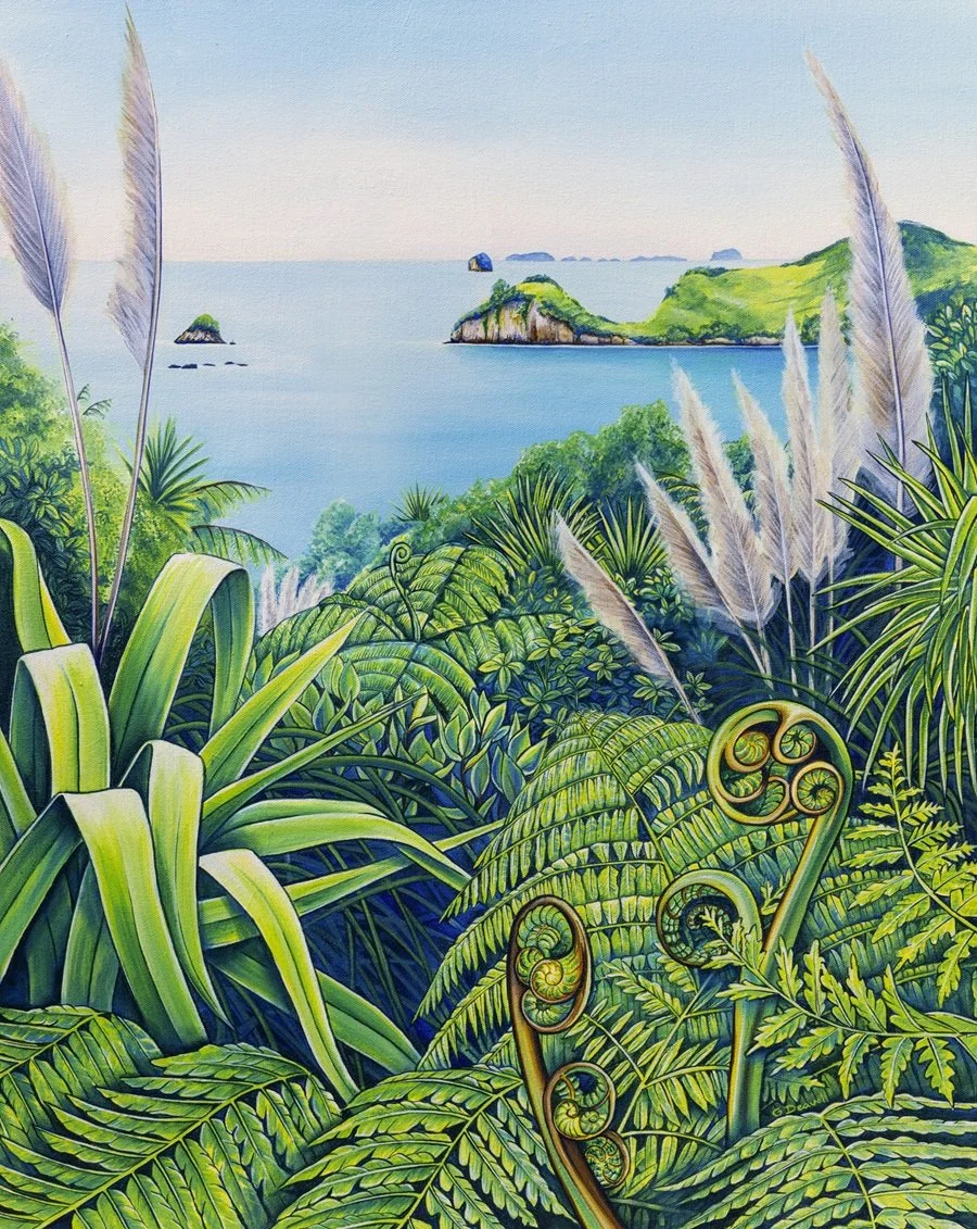 Looking down over Hahei Beach, framed by punga and native foliage in the foreground, this piece captures the serene beauty and lush coastal landscape of the Coromandel.