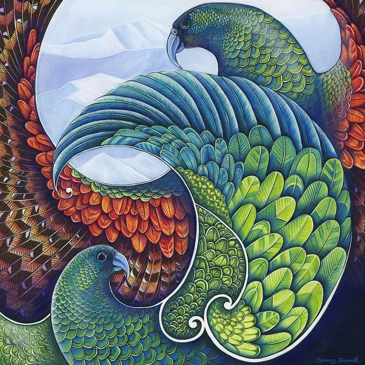 This piece celebrates the cheeky, inquisitive nature of the kea, perched confidently on alpine rocks alive with hardy mountain plants. Their bright eyes and curious posture capture the playful intelligence they’re so well known for, while the textured flora beneath them grounds the scene in the rugged, high-altitude world they call home.